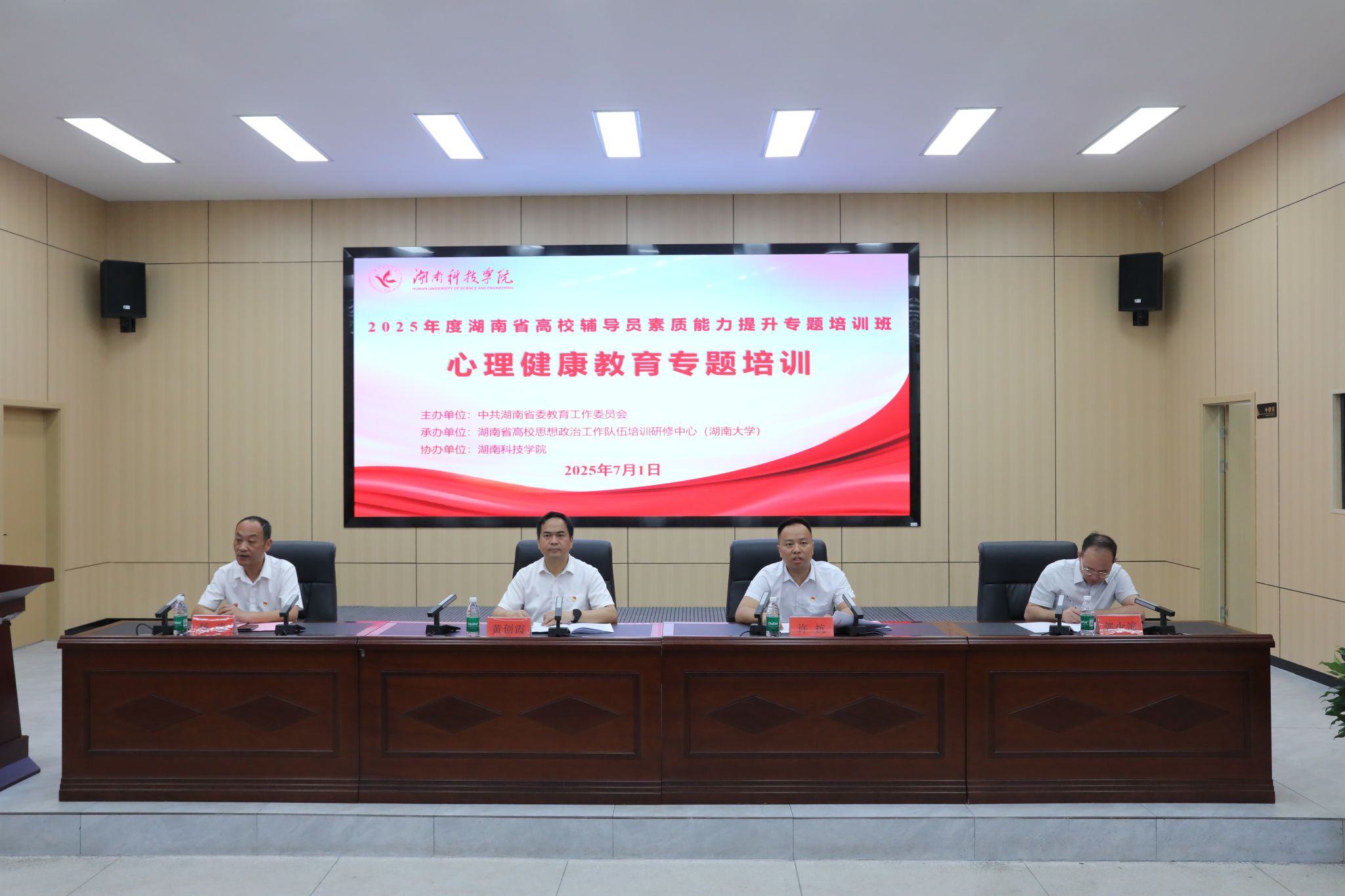 本网讯(通讯员 蔡彦婷)7月1日上午,2025年度湖南省普通高校辅导员心理健康教育专题培训班在我校举行。湖南省委教育工委宣传部部长、湖南省教育厅思政处处长许抗,校党委副书记、校长黄创霞,湖南大学党委学生工作部副部长郭少滨出席开班仪式。仪式由校党委委员、组织部部长杨涛主持。