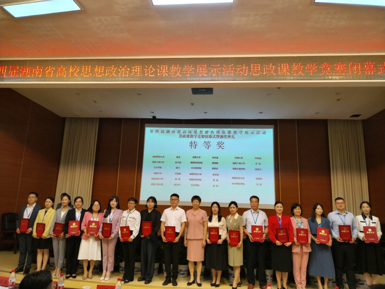 本网讯(通讯员 易倩文)9月23日,由湖南省教育厅主办的第四届湖南省高校思想政治理论课教学展示活动思政课教学竞赛在湖南工商大学举行。经过激烈角逐,马克思主义学院周梅、谢周艳两位教师分别荣获大赛本科组《思想道德与法治》《马克思主义基本原理》课特等奖,毛文杰荣获大赛本科组《习近平新时代中国特色社会主义思想概论》一等奖,刘克方荣获大赛本科组《中国近现代史纲要》二等奖,实现了我校在省级思想政治理论课教学展示活动思政课教学竞赛新的突破。