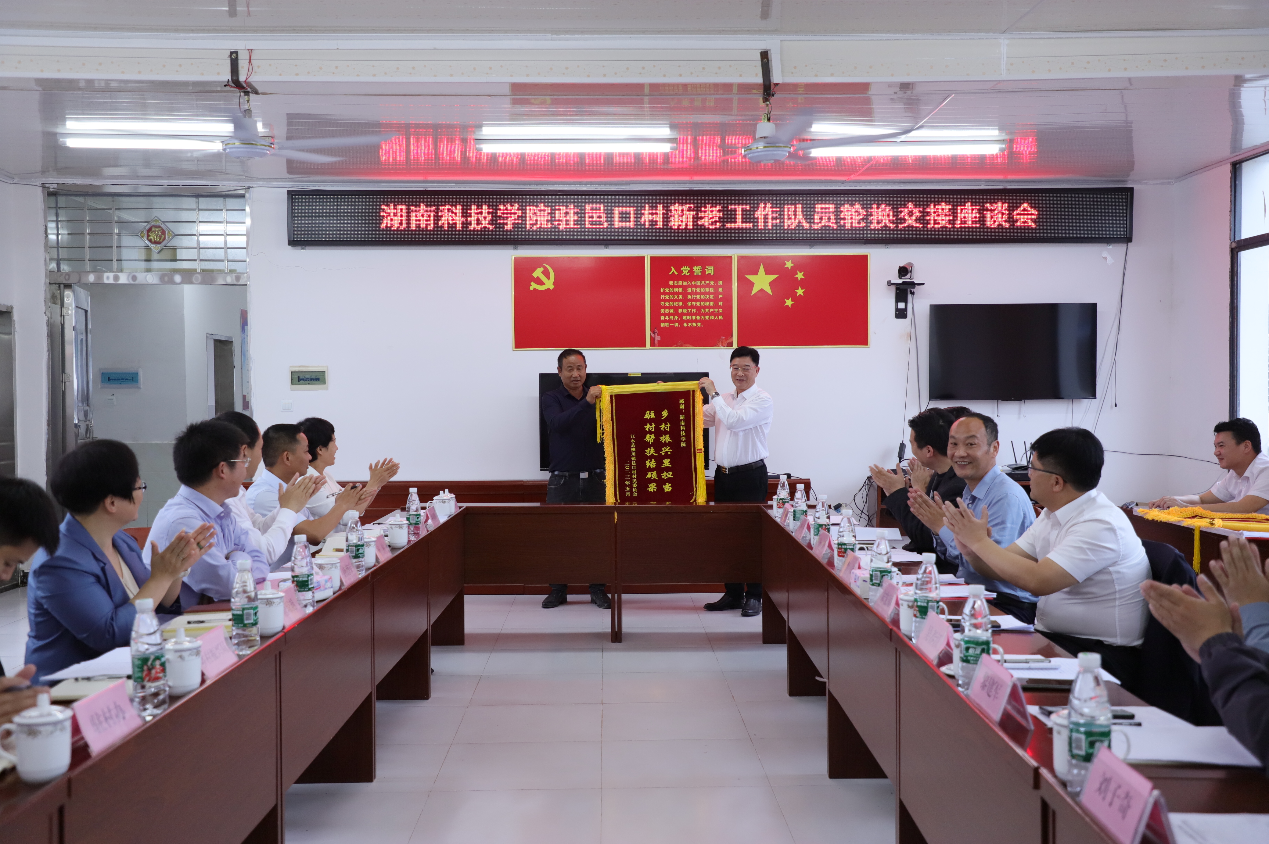邑口村村支书尹胜飞代表邑口村村支“两委”赠送学校及第一轮驻村工作队锦旗,宋宏福与第一轮驻村工作队接旗。随后,拼搏在线(中国)唯一官方网站向邑口村捐赠了乡村振兴项目资金。