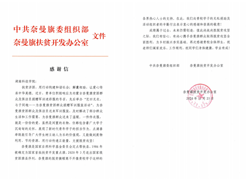 本网讯 日前,学校收到来自内蒙古自治区奈曼旗扶贫开发办公室和中共奈曼旗委组织部邮寄而来的锦旗和感谢信,向我校为内蒙古奈曼旗贫困群众及保洁员捐赠军训迷彩服的志愿行动表达真挚感谢。
