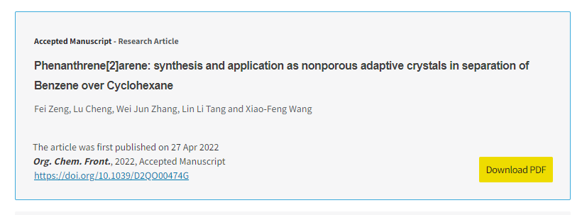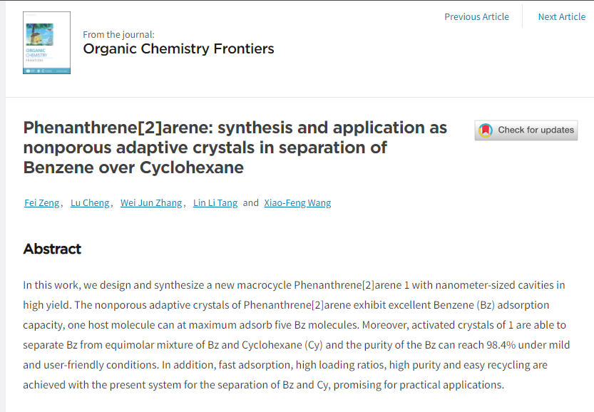 本网讯 近日,国际知名期刊Organic Chemistry Frontiers,DOI:10.1039/D2OO00474G(中科院一区TOP,IF= 5.281)发表了拼搏在线(中国)唯一官方网站化学与生物工程学院功能材料团队的最新研究成果“Phenanthrene[2]arene: synthesis and application as nonporous adaptive crystals in separation of Benzene over Cyclohexane”(菲[2]芳烃的设计合成及非多孔自适应性晶体分离苯与环己烷的应用研究),该研究成果由功能材料团队成员独立完成,曾飞博士为第一作者和通讯作者。