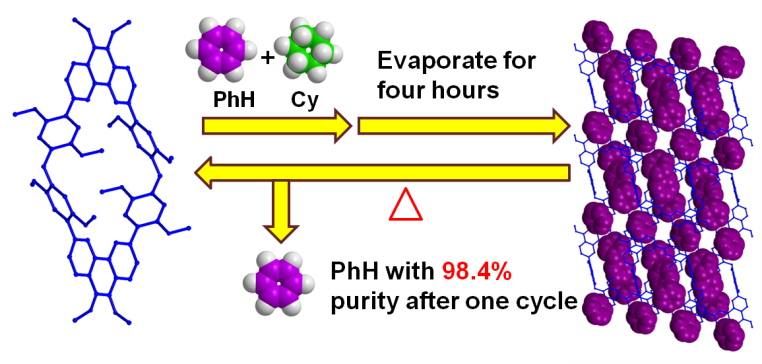 在此基础上,研究团队以菲为构筑单元,在三氟化硼乙醚溶液催化下高产率(72%)合成了具有纳米空腔的菲[2]芳烃。气体吸附实验发现,1分子的菲[2]芳烃可以吸附5个苯环分子,这是目前已报道类似化合物对苯环分子的最大吸附值的2.5倍(文献报道的最大值为1分子主体可以吸附2个苯环分子)。此外,活化的菲[2]芳烃晶体可以从苯和环己烷的等摩尔混合物中选择性分离出苯分子, 纯度高达98.4%,且可以重复多次利用。相比传统的苯和环己烷分离技术,该方法具有节能环保、高吸附量、吸附速度快、可重复利用、分离纯度高等优点,在化工和石化行业中具有巨大的应用前景。该研究获得了国家自然科学基金、湖南省自然科学基金,拼搏在线(中国)唯一官方网站化学工程与技术应用特色学科等经费支持。