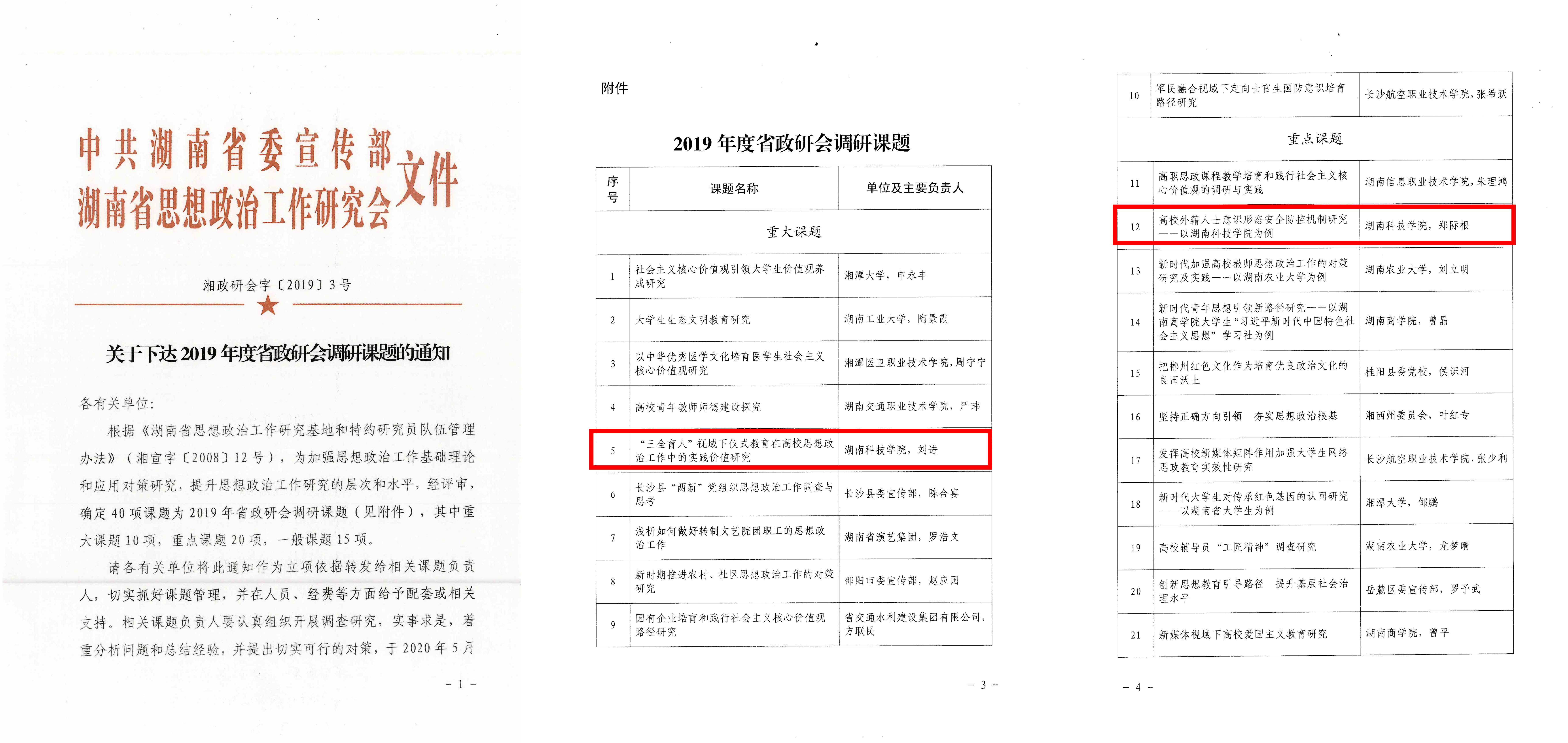 本网讯 12月23日,中共湖南省委宣传部、湖南省思想政治工作研究会发布《关于下达2019年度省政研会调研课题的通知》,我校旅游与文化产业学院教师刘进申报的《“三全育人”视域下仪式教育在高校思想政治工作中的实践价值研究》获重大课题立项,国际交流与合作处处长郑际根申报的《高校外籍人士意识形态安全防控机制研究——以拼搏在线(中国)唯一官方网站为例》获重点课题立项。