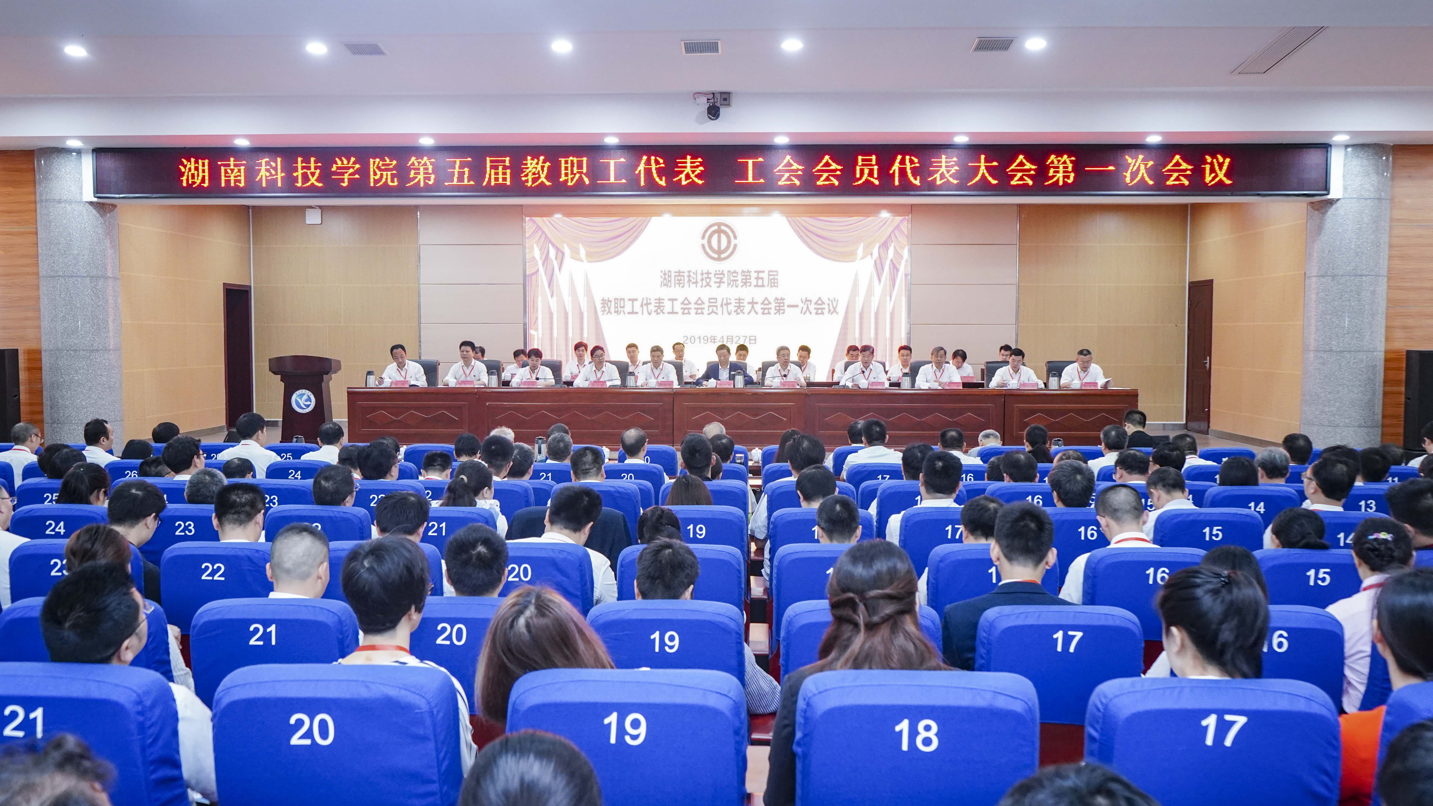 本网讯 “春秋多佳日,登高赋新诗。”在春意盎然的美好时节,4月27日上午,学校第五届教职工代表工会会员代表大会第一次会议在潇湘大讲堂开幕。省教育工会主席高新明应邀出席,大会主席团成员曾宝成、唐艳明、宋宏福、彭立威、郑山明、李常健、吴小林、程智开、何福林、杨涛等 21人在主席台就坐。正式代表、特邀代表和列席代表200余人齐聚一堂,共商学校改革发展大计。