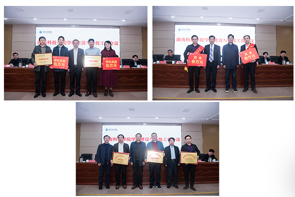 大会对学科建设和科技工作作出贡献的单位和个人进行表彰。马克思主义理论和中国语言文学两个学科2018年被立项为省级应用特色学科;刘小文、黄渊基分别获得2018年省科技进步奖;湖南恒伟生物医药创新创业团队、土传病害绿色防控湖南省工程研究中心、湖南省李达与马克思主义三化研究基地2018年被立项为省级科研平台。曾宝成、宋宏福、彭立威、郑山明、李常健、吴小林分别为上述单位和个人现场颁奖。