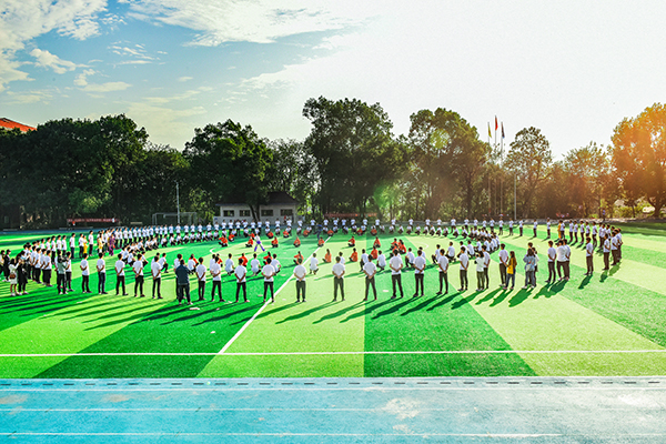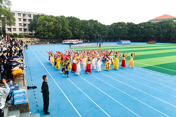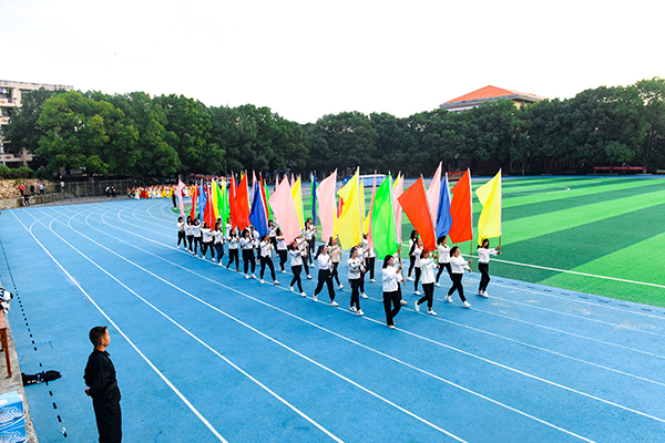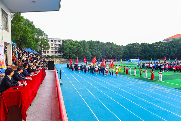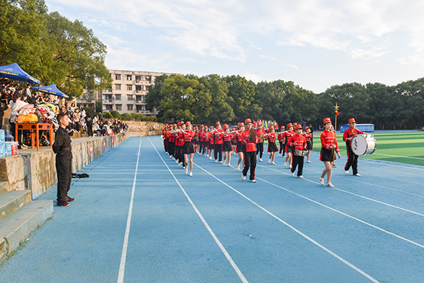 上午七时三十分,阳光洒满了田径场。入场式开始,伴随着振奋人心的运动员进行曲,护旗手们迈着有力的步伐,护送国旗、校旗和会旗经过主席台;紧随而来的乐队、彩旗队、彩球队、鲜花队的同学们气宇昂扬、朝气蓬勃地入场;各机关、二级学院代表队及裁判员代表队创意满满、英姿飒爽地经过主席台接受检阅,他们口号嘹亮、步伐矫健,赢得了现场观众一阵阵热烈的掌声。