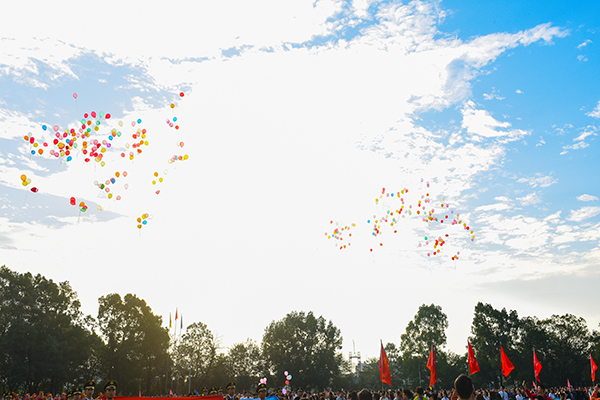 随即礼炮响彻云霄,彩色气球放飞天空。全校武术及跆拳道爱好者为全校师生带来精彩的跆拳道及武术表演。他们呈圆环形队形,步调一致,整齐有序,出拳干脆利落,动作矫健有力,每一次抬腿、踢板、转身、出腿都舒展豪放,洒脱自如,展示了博大精深的中华武术文化,引起现场观众阵阵高喊,欢呼声、掌声响彻全场。
