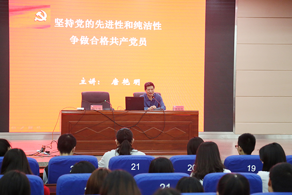 唐艳明以《坚持党的先进性和纯洁性争做合格共产党员》为题,就马克思主义政党的纯洁性以及共产党党员的先进性和纯洁性的内涵进行深入阐释。他指出,必须准确把握时代脉搏,始终与时代发展同步伐;必须把广大人民的利益作为全部工作的出发点和落脚点,始终与人民群众共命运;必须使党的理论和路线方针不断与时俱进,保证党的全部工作始终符合实际和社会发展规律;必须围绕党中心任务来进行党的先进性和纯洁性的建设,保证党始终引领中国社会发展进步;必须坚持党要管党,从严治党,保证党始终有蓬勃生机和旺盛活力。