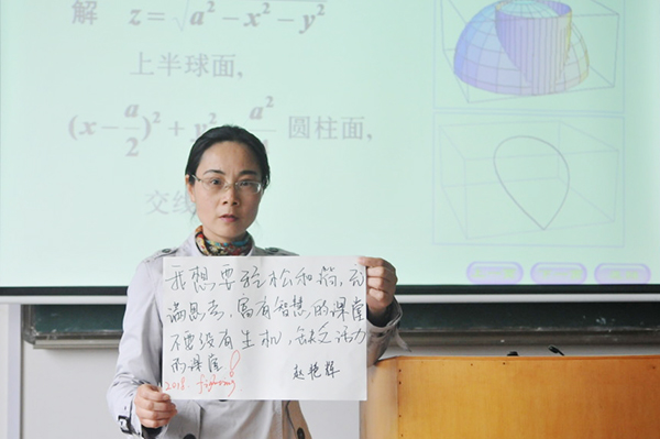 “我想要轻松和谐、充满思考、富有智慧的课堂,不要没有生机、缺乏活力的课堂。”上课细致严谨却又自带亲和力的理学院赵艳辉老师这样说。热爱教育、关心学生的她,希望通过思考、交流,课堂能够生动有趣,而不是枯燥无味。