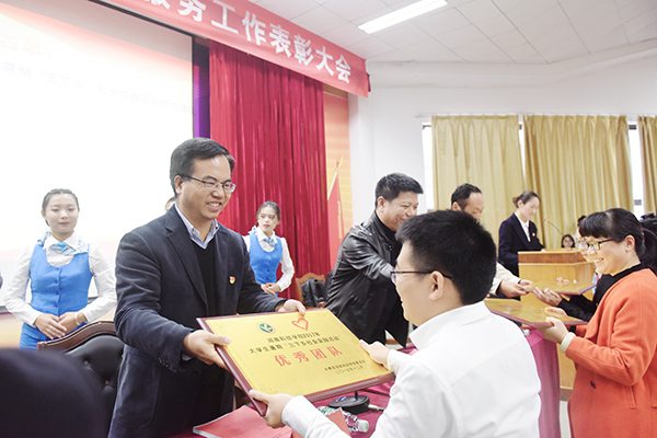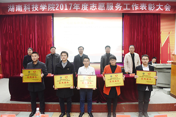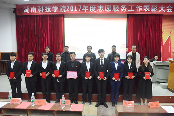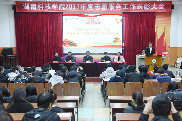 本网12月5日讯 12月5日是国际志愿者日,为表彰积极投身于志愿服务、无私奉献的志愿者们,学校举行2017年志愿服务工作暨社团工作表彰大会。校党委书记陈弘、副校长程智开、永州市中心血站站长郑淑山等出席会议,并为2017年志愿服务工作优秀团队、优秀指导老师、最美志愿者以及荣获湖南省2017年"百优十佳社团"的集体和个人进行颁奖。