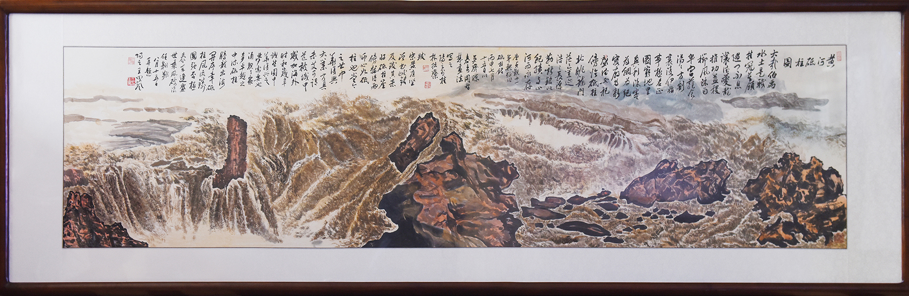 据介绍,这幅长2.8米,宽1米的巨幅画作由我校退休教师王田葵教授历时近半年时间创作完成。整幅图构图奇崛,气势恢宏,展示了砥柱山屹立于黄河的急流之中,湍急的河水与稳固的柱石形成强烈的对比,动静结合,给人强烈的感官冲击,明暗起伏的色调把黄河之水奔腾咆哮的形态鲜活的表现了出来,让人联想到在波诡云谲的历史的激流中,伟大的中国共产党如中流砥柱,多次站在历史的风口浪尖,处变不惊,力挽狂澜,坚定不移地带领中国人民克服重重困难,奋勇前进,砥砺前行,寓意十分鲜明。