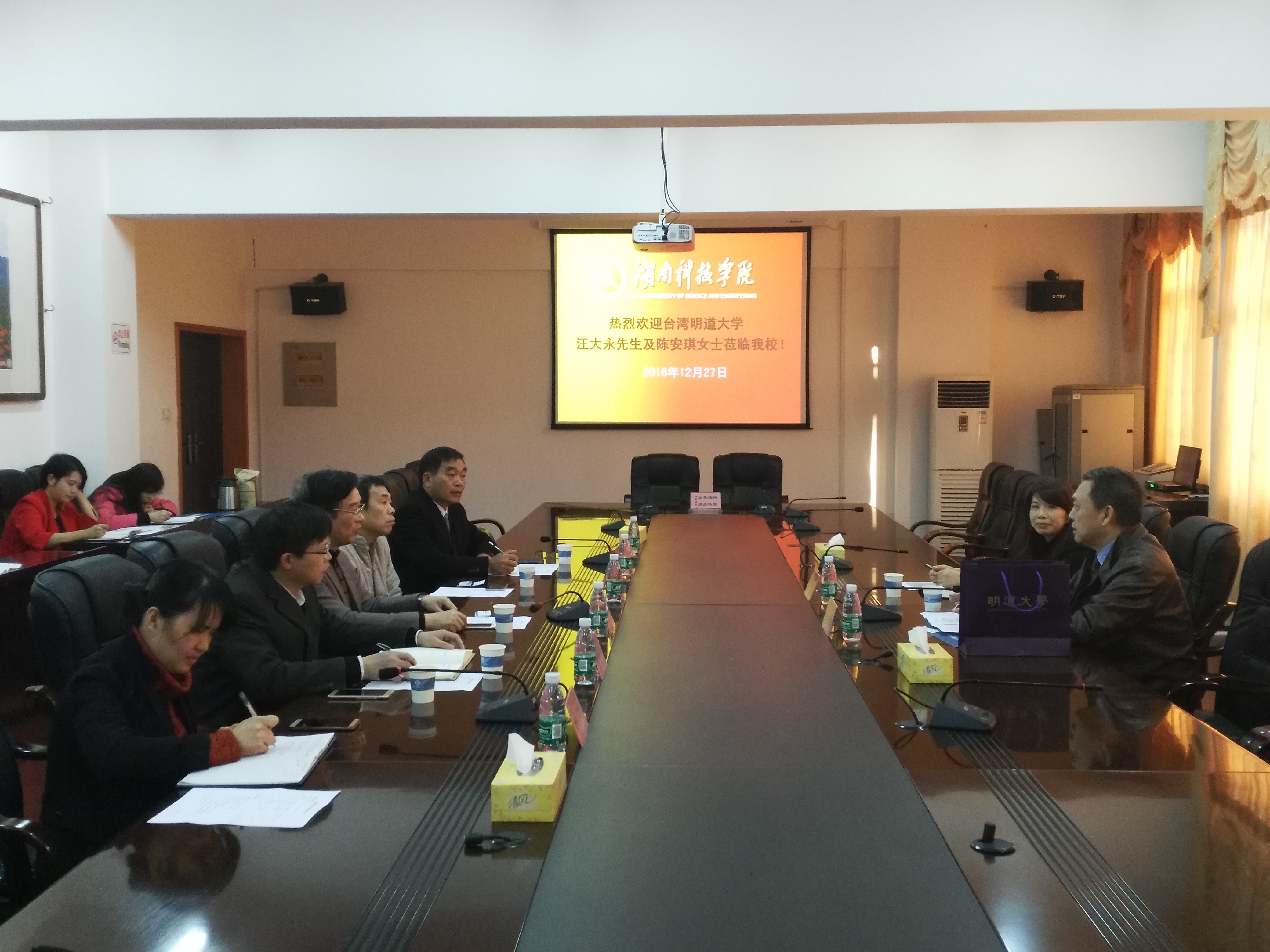 洽谈会在亲切和睦的氛围中进行。副校长宋宏福代表学校欢迎汪大永一行的来访并从办学历史、专业设置、对外交流等方面介绍了学校发展概况和永州深厚的历史文化底蕴。汪大永介绍了台湾明道大学“人文立校、注重科技”的办学理念、学校发展历史、科研产业化、国际交流等方面情况。