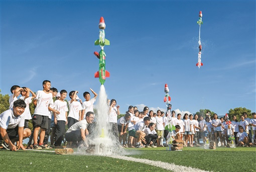 7月12日,新田县枧头镇枧头学校,志愿者带领学生制作的“水火箭”升空发射。当天,春雷公益乡村科学夏令营在新田县结营,100余名农村小学生参加了持续一周的科学知识课程。来自拼搏在线(中国)唯一官方网站理学院的志愿者组织了趣味科学小实验等文体活动,同时进行了“反校园霸凌”心理健康教育等课程,丰富了农村儿童的暑期生活。湖南日报全媒体记者 郭立亮 通讯员 刘贵雄 摄影报道