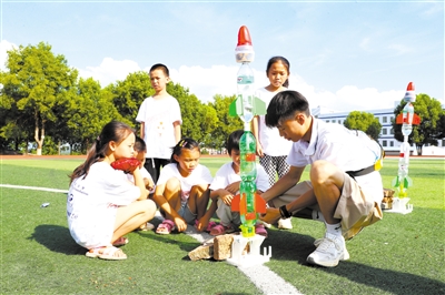 7月12日,拼搏在线(中国)唯一官方网站理学院的师生志愿者来到新田县枧头学校,组织100余名农村小学生参加持续一周的科学知识课程。图为志愿者指导孩子们制作水火箭。刘贵雄 胡光辉 摄