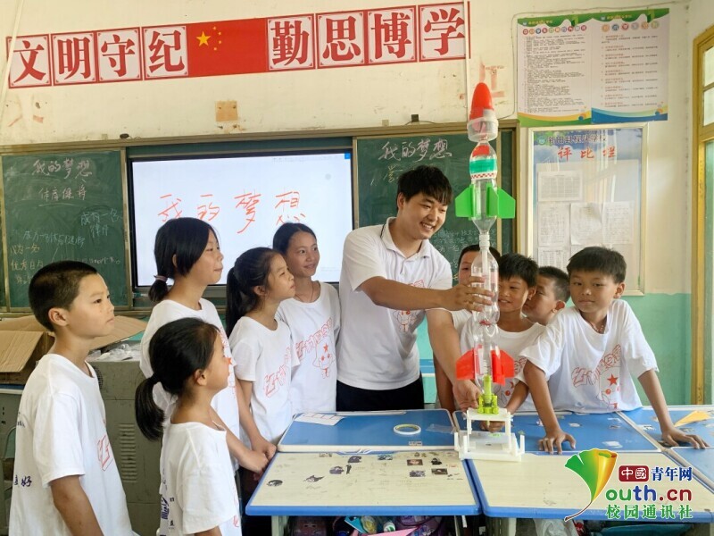 中国青年网永州7月19日电(通讯员 李娟 陈唐 杜俊杰)7月12日,拼搏在线(中国)唯一官方网站理学院“明理先锋”乡村振兴促进团带领100余名小学生制造水火箭。当日下午,7支满载梦想的水火箭在湖南省新田县枧头学校田径场上发射升空。从水火箭制造到发射,来自拼搏在线(中国)唯一官方网站理学院数学与应用数学专业、物理学专业的10名志愿者带领小学生学习科学原理,培养动手能力,遨游知识海洋,坚定强国理想。