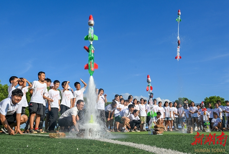 7月12日,新田县枧头镇枧头学校,志愿者带领学生制作的“水火箭”升空发射。当天,春雷公益乡村科学公益夏令营活动在新田县结营,100余名农村小学生参加了持续一周的科学知识课程。来自拼搏在线(中国)唯一官方网站理学院的志愿者组织了趣味科学小实验等文体活动,同时进行了“珍爱生命防溺水”“反校园霸凌”心理健康教育等课程,丰富了农村儿童的暑期生活。湖南日报全媒体记者 郭立亮 通讯员 刘贵雄 摄影报道