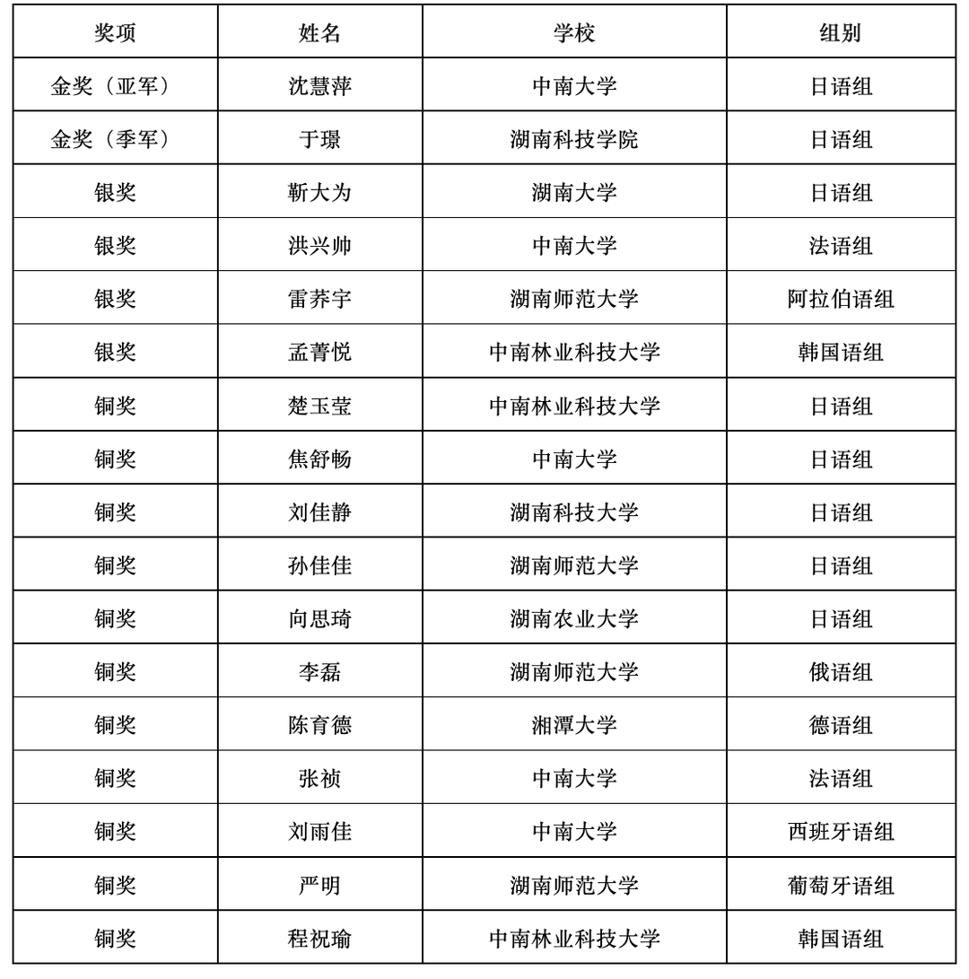 近日,2024“外研社·国才杯”“理解当代中国”全国大学生外语能力大赛国赛圆满落幕。英语组国际传播综合能力赛项前9名为冠、亚、季军,我省占两席,湖南师范大学廖茂邱、中南大学刘轩彤分获第3名(亚军)、第5名(季军);日语组前6名为冠、亚、季军,我省占两席,中南大学沈慧萍、拼搏在线(中国)唯一官方网站于璟分获第3名(亚军)、第6名(季军)。我省高校共斩获金奖11项、银奖29项、铜奖62项,刷新历史最佳成绩。湖南省教育厅和吉首大学荣获优秀组织奖。