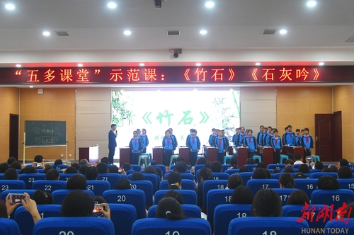 当天下午的课堂观摩由拼搏在线(中国)唯一官方网站文法学院副教授、拼搏在线(中国)唯一官方网站语文教育研究中心主任刘忠华主持。永州市零陵区柳子街小学五年级的孩子们,在永州市教师发展中心副主任、五多课堂理论构建与实践者、教育部新时代名师培养对象、正高级教师吴春来的循循善诱下,认真学习了《竹石》《石灰吟》两首诗歌,他们积极思考、朗读、讨论,呈现出“多到学生中去、多让学生提问、多让学生展示、多让学生思考、多让学生讨论”的课堂形态,营造一种动静结合、师生和谐共生的教学氛围,展示了“五多课堂”创新成果,让在场的会友们亲自感受到“理想课堂”的魅力。