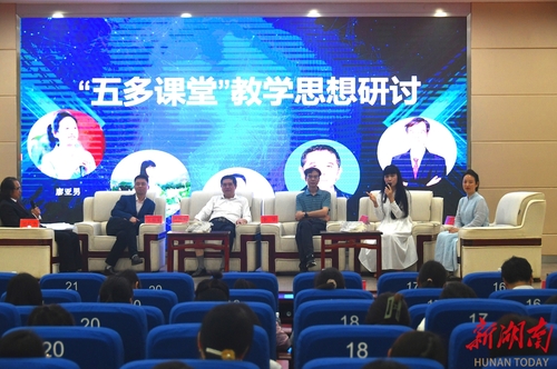 在主题论坛阶段,播放了湖南第一师范学院星沙实验小学的教师代表发来的集体感言视频。紧接着,吴春来分享“五多课堂”的核心思想,湖南科技大学教授、博士生导师李学等四位嘉宾先后分享对“五多课堂”的认识。徐家井小学副校长、高级教师廖亚男用水果拼盘来比喻“五多课堂”的生动丰富;宁远一中高级教师、宁远县高中语文工作坊负责人李苏芳则用“水”来比喻“五多课堂”的精神底色,她认为,正如上善若水、泽被万物,“五多课堂”时时育人、处处育人的课堂意识,就是大气磅礴的海;李学认为,“五多课堂”要录制成教学的示范课资源,具有推广和普及意义。拼搏在线(中国)唯一官方网站文法学院副教授、语文教育研究中心副主任蒋扬帆,则由高校师范类语文教育能力培养现状引入,借大力推广“五多”课堂,促进师范专业学生语文教育理论水平与实践能力提升。
