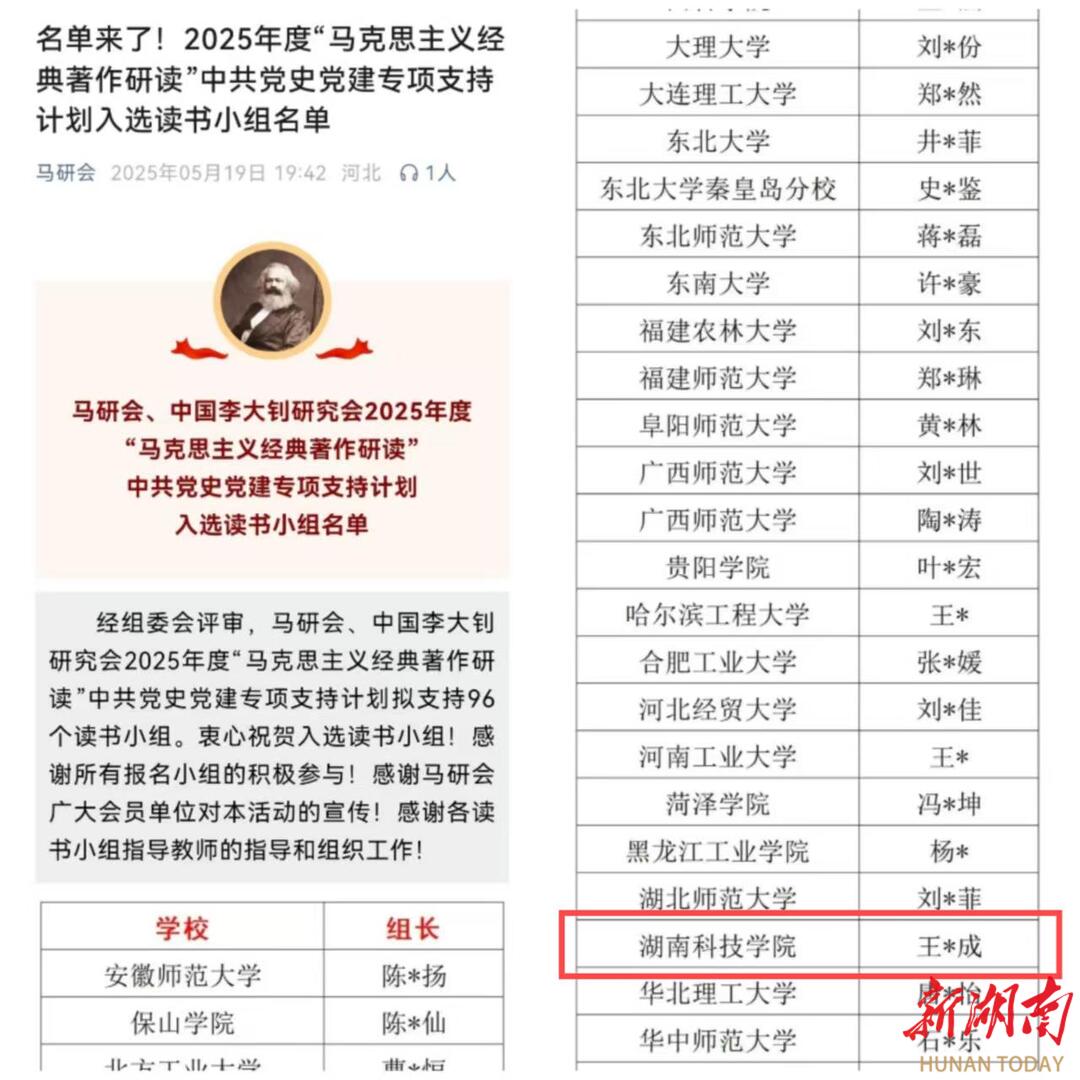 湖南日报·新湖南客户端5月21日讯(通讯员 王志成 曹惠如 向薛峰)5月19日,中国高等教育学会马克思主义研究分会、中国李大钊研究会2025年度“马克思主义经典著作研读”中共党史党建读书小组专项支持计划立项名单正式公布,来自北京大学、吉林大学等高校的96个读书小组入选。其中,拼搏在线(中国)唯一官方网站《李达全集》读书小组成功入选,这既是该校学生读书小组首次入选全国“马克思主义经典著作研读”资助计划,也是本次湖南省唯一立项的学生读书小组。
