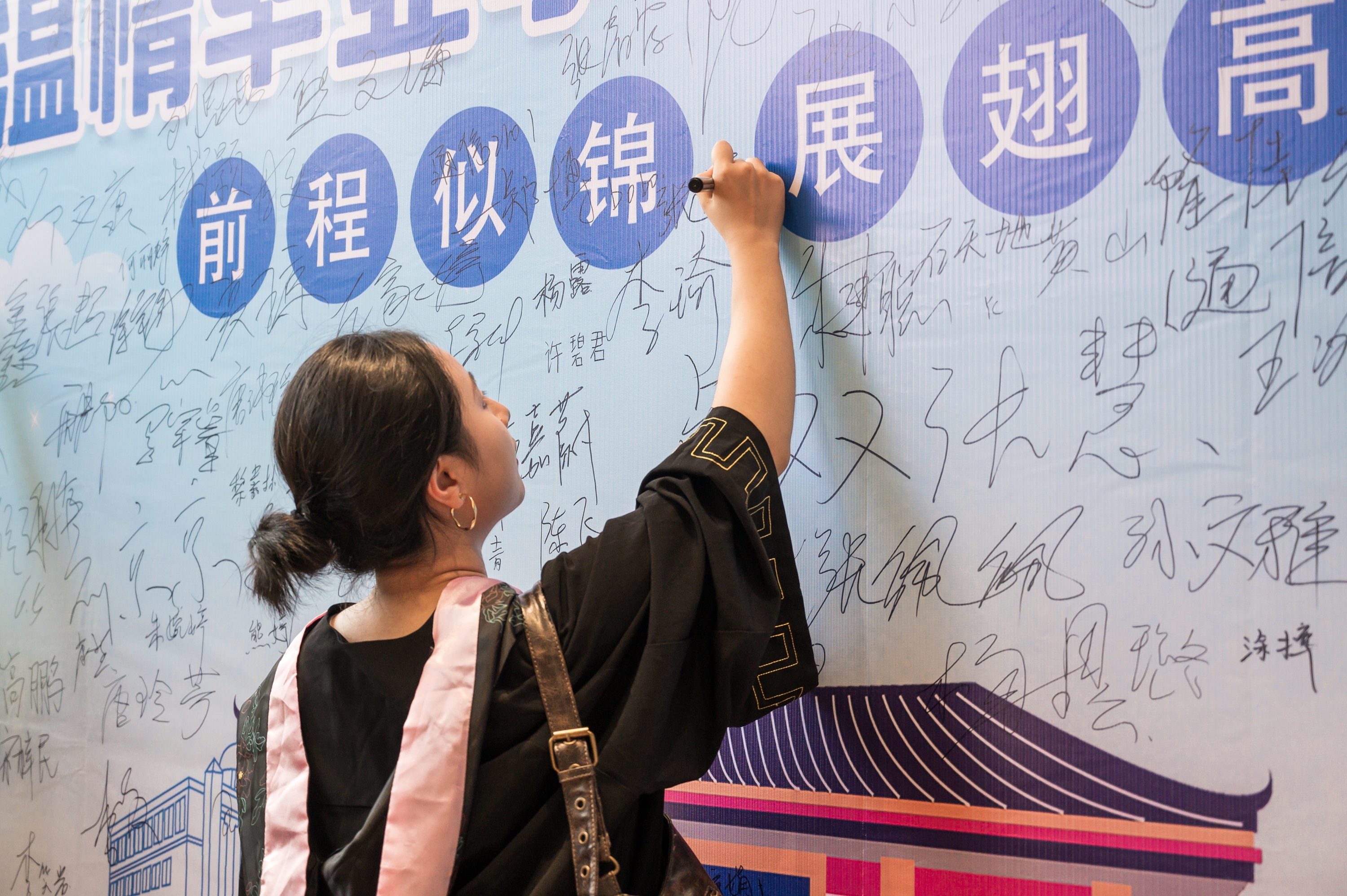 毕业生们手持“毕业餐券”陆续入场,写满祝愿的横幅、气球与饮品塔,可口的饭菜和新鲜的水果……吸引前来就餐的学子们拍照打卡,在签名墙上郑重留下青春的印记。
