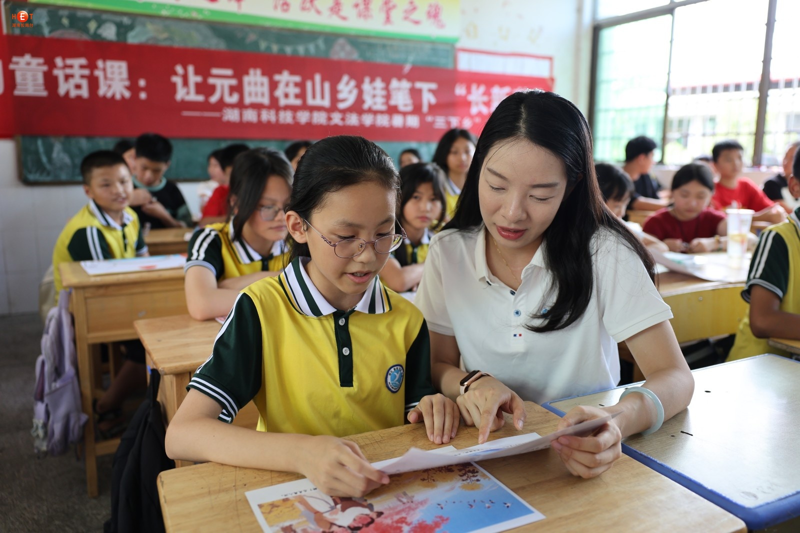 “柳丝长,春雨细,花外漏声迢递。”当六年级学生陈小雨用永州方言念出关汉卿《大德歌・春》时,教室里爆发出清脆的笑声——近日,拼搏在线(中国)唯一官方网站文法学院“三下乡”团队在祁阳市浯溪完全小学打造“元曲里的童话课”,让元曲在山乡娃笔下“长新芽”。