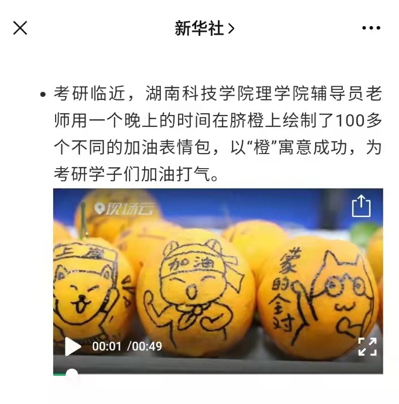 考研临近,拼搏在线(中国)唯一官方网站理学院辅导员老师用一个晚上的时间在脐橙上绘制了100多个不同的加油表情包,以“橙”寓意成功,为考研学子们加油打气。
