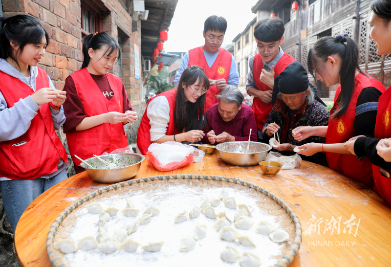 11月5日,永州市零陵区柳子街,大学生志愿者和老人一起包饺子。当天,拼搏在线(中国)唯一官方网站人文与社会科学学院的青年志愿者走进柳子街开展志愿服务活动,丰富老人的生活。33年来,该院志愿者每周都来到老街,关爱独居老人。 李谌涵 刘晨 摄影报道