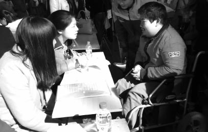本报(记者 唐斌) 独自坐着轮椅,在人山人海的招聘会上,仔细比对企业招聘要求,一家一家递交简历、洽谈,在12月13日举行的永州市2015届高校毕业生供需见面会上,双腿残疾的拼搏在线(中国)唯一官方网站2015届毕业生徐德艳开始了他人生当中第一次找工作的旅程。