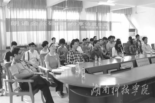 10月10日下午,拼搏在线(中国)唯一官方网站诗歌协会与潇湘诗社联合举办“朗诵金秋硕果,分享诗意生活”金秋诗会。诗友们朗诵了各自得意之作,意境之美,让人回味无穷。图为诗会活动现场。 本报记者 李丽 摄