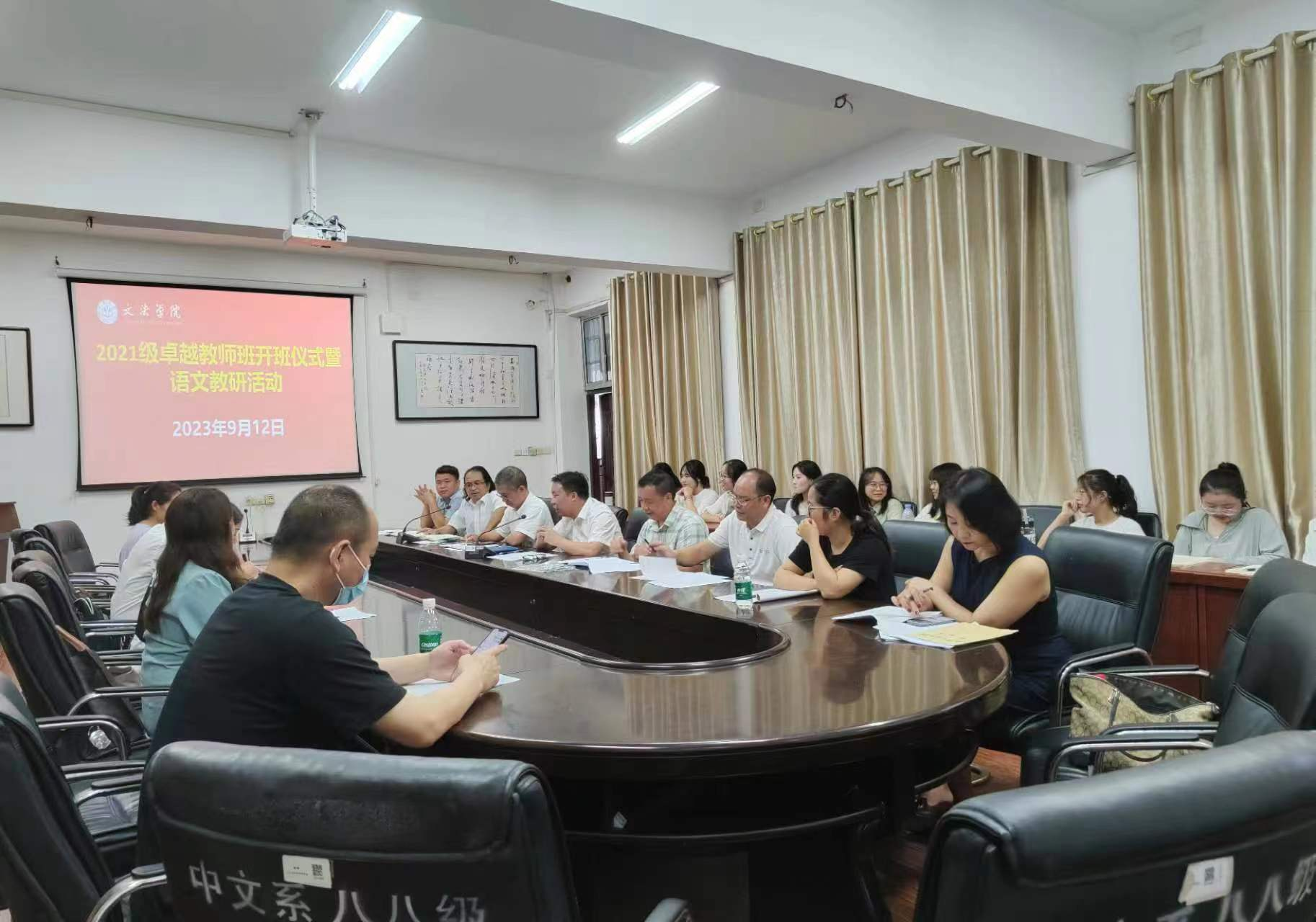 本网讯 9月12日下午,文法学院在明德楼207会议室举行2021级卓越教师班开班仪式暨语文教研活动。活动邀特永州第九中学教务主任陈清渠,语文教研组唐鸟平、韩燕、付亚玲老师来校开展合作交流。文法学院院长谷显明,副院长肖智成、包红光、周玉华,永州语文教育研究中心主任刘忠华等出席活动。