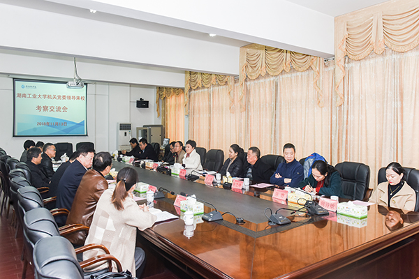 本网讯 11月13日,湖南工业大学机关党委书记雷敏一行来校考察交流,校党委副书记唐艳明,党委委员、组织部长何福林,机关党委书记、学工部、党政办等部门负责人参加座谈。