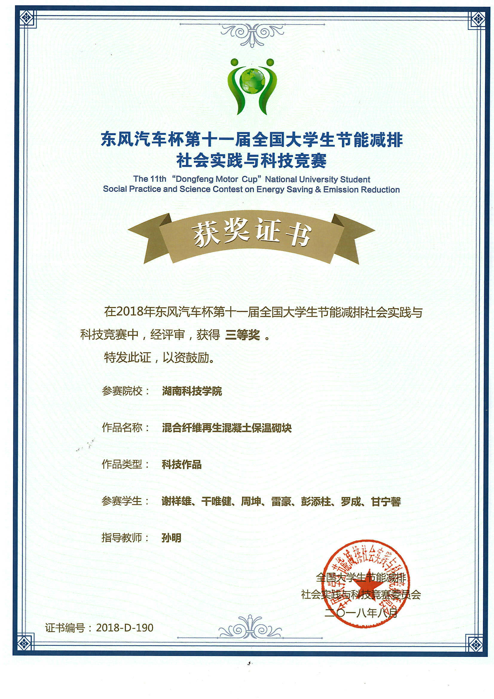 本网讯  近日第十一届全国大学生节能减排社会实践与科技竞赛公布获奖名单并下发获奖证书,土木与环境工程学院教师孙明指导的谢祥雄团队作品“混合纤维再生混凝土保温砌块”喜获三等奖,实现了土环学院在该项赛事上获奖零的突破,也是我校第二次在该项赛事上获奖。