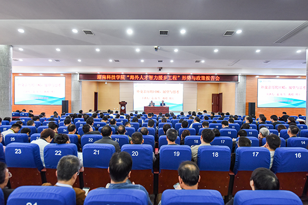 本网讯   10月30日上午,学校召开“海外人才智力援乡工程”形势与政策报告会,特邀外交学院原党委书记、常务副院长袁南生教授来校作报告。永州市人大常委会副主任、党组成员李农妹,市侨联党组书记、副主席柏继平,美洲湖南永州同乡会会长聂社春,美洲湖南永州同乡会副会长、墨西哥湖南总商会副会长陈和喜,中铁五局贵州公司总经理邹少龙,(香港)深圳汇聚天下投资控股有限公司董事戴亚林,校长曾宝成及在校领导,学校师生代表800余人参加报告会。报告会由校党委书记陈弘主持。