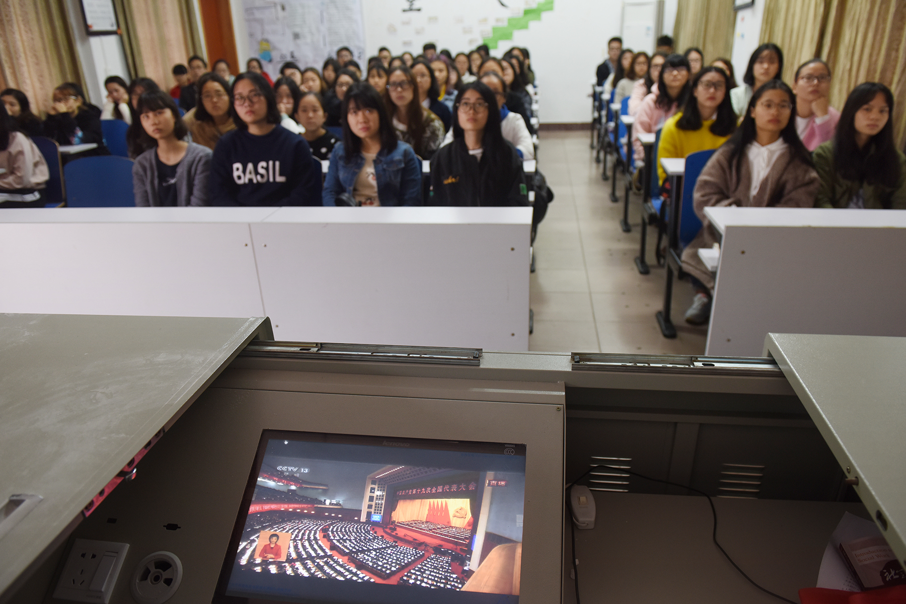 本网讯  今天上午,中国共产党第十九次全国代表大会在北京人民大会堂隆重开幕,学校组织收看中国共产党第十九次全国代表大会开幕会的直播盛况,全校师生纷纷通过广播、电视、网络、手机、校园电子显示屏等形式收听收看开幕式,热切关注十九大。