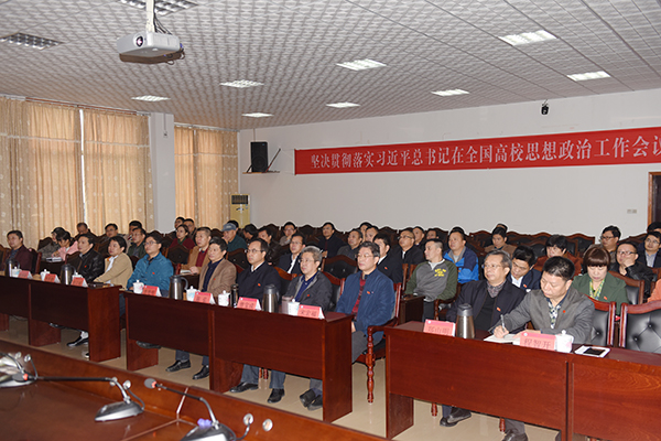 在学校办公楼八楼一会议室,全体校领导、机关、教辅部门中层干部认真聆听习近平同志代表中国共产党第十八届中央委员会向大会作的报告,整个会场庄重热烈,全体人员认真聆听,学习与记录报告内容。