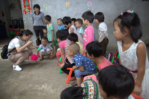 在村幼儿园,党外知识分子联谊会和民革支部分别组织对幼儿园孩子开展普通话教育和留守儿童心理健康教育。普通话甲级乙等专业教师宋淑媛,通过有奖回答的方式将孩子们引入课堂,孩子们也非常踊跃地回答问题,气氛十分活跃。民革支部党员、心理咨询师唐良玉老师,通过组织孩子们游戏的方式了解留守儿童的心理健康问题,并给他们提出了具体解决办法。