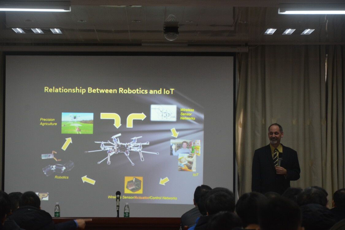本网讯(通迅员姜丽琪 孙浩东 朱梦)机器人是衡量一个国家科技创新和高端制造业水平的重要标志。12月5号上午,经校党委书记陈弘的邀请,在知行楼107,美国普渡大学特聘杰出学者Richard Voyles教授以为“机器人世界前沿研究进展”为主题为电子与信息工程学院相关专业师生,分享了普渡大学机器人研究的最新进展。